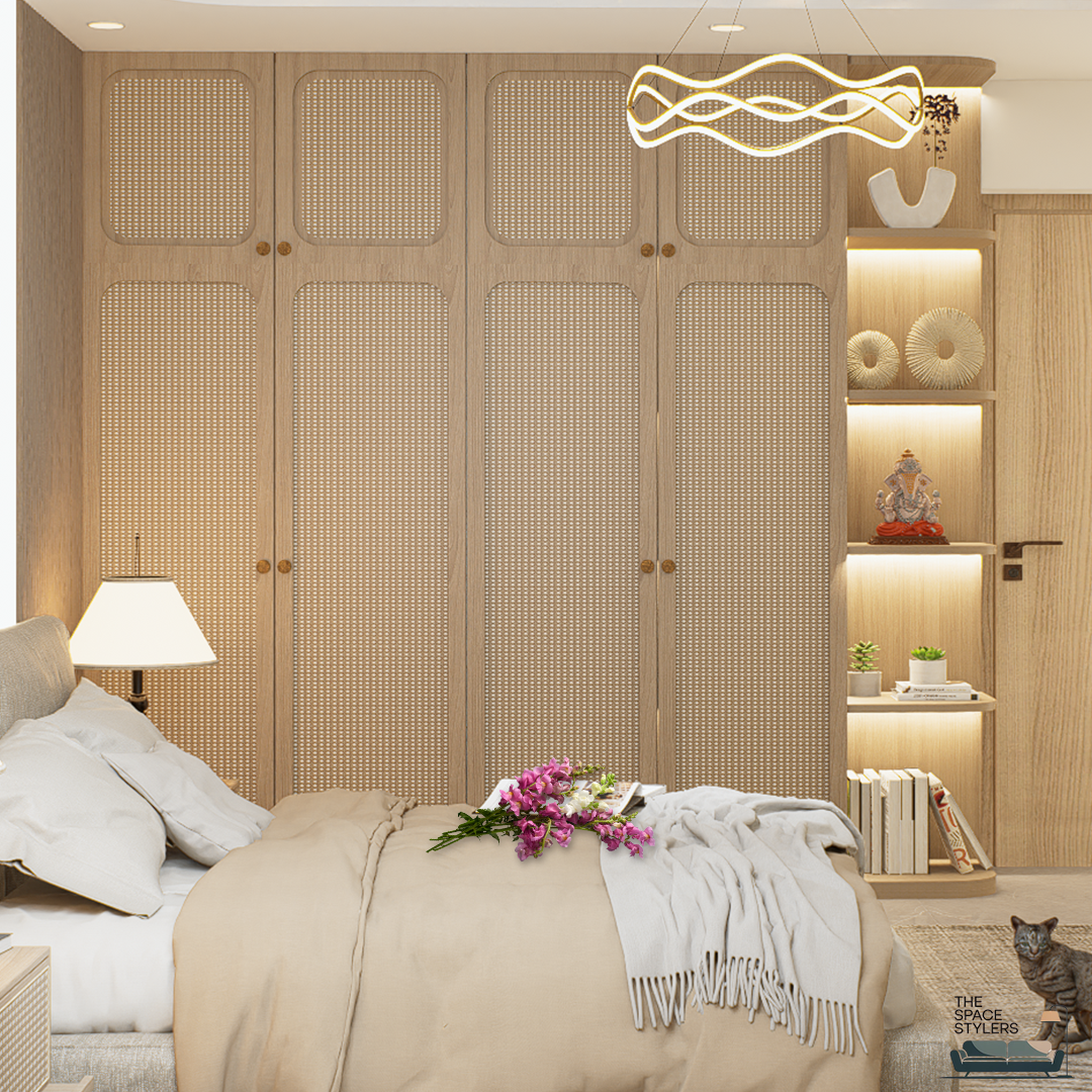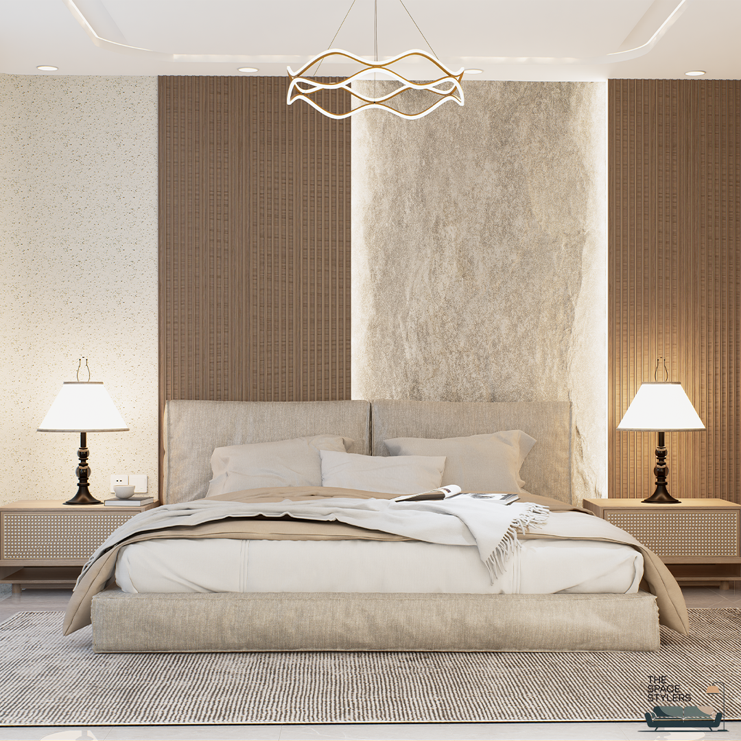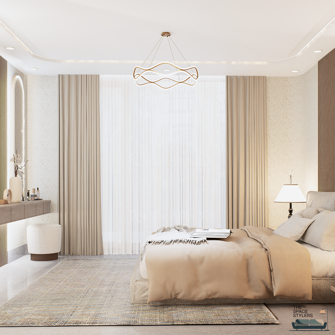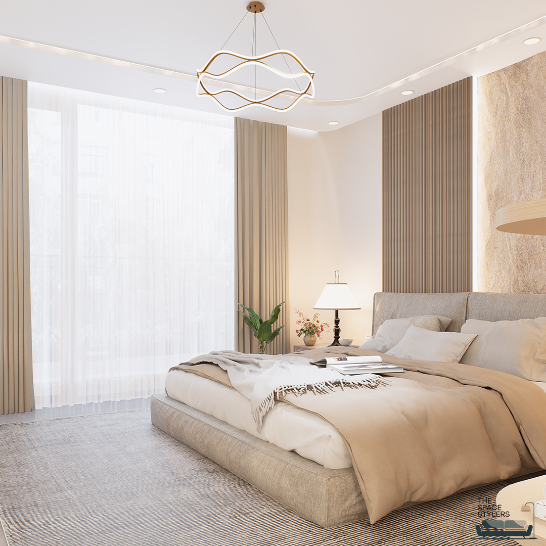 This bedroom interior is designed as a calm and restful retreat, focusing on warmth, comfort, and subtle elegance. The space features a soft, neutral palette complemented by natural wood finishes, creating a soothing and inviting atmosphere.