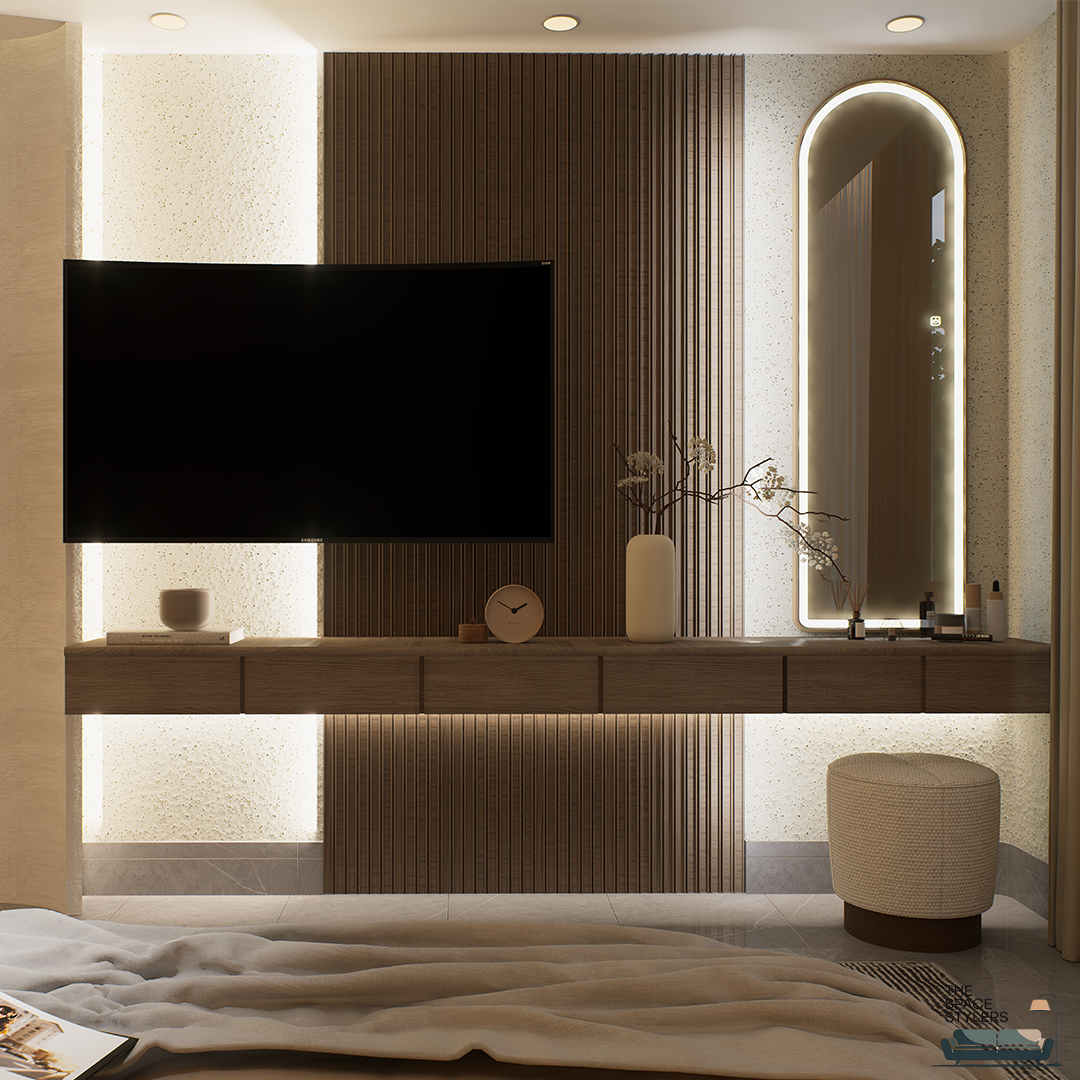 The design emphasizes minimalism with thoughtful detailing, where built-in storage units and paneling seamlessly blend functionality with aesthetics. Soft lighting elements are carefully integrated to enhance the ambiance, while maintaining a cozy and intimate environment. The overall composition reflects a balance between modern simplicity and timeless comfort.